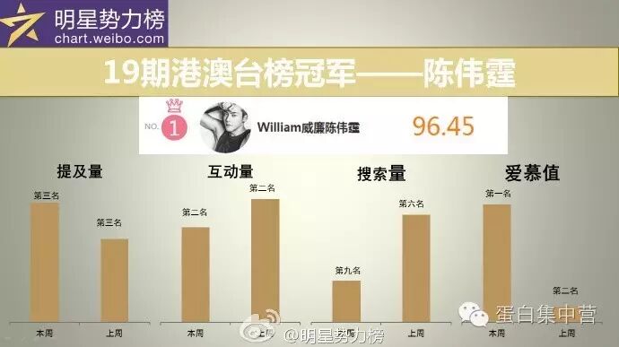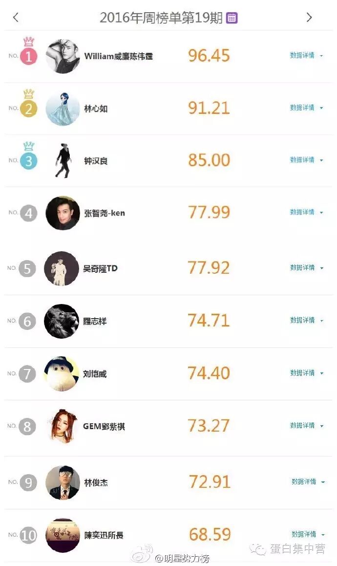 明星势力榜第十九期港澳台榜周榜陈伟霆继续蝉联夺冠