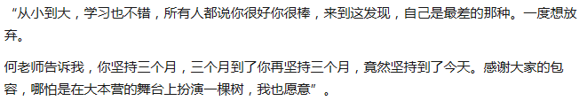 这段看起来是回应,更像是“心灵鸡汤”的话,在我看来,其实就是在对自己是否适合“演员”道路的一种温柔的宣战。