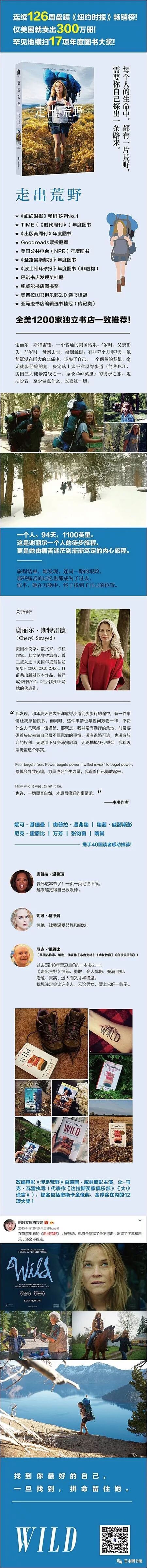 《走出荒野》内容简介:本书是根据作者谢丽尔·斯特雷德的真实经历写成。谢丽尔·斯特雷德,一个普通的美国女子。6岁时,嗜酒暴烈的父亲从她的生命中消失,22岁时,亲密无间的母亲因病突然去世,自此,家不成家,姐弟间日渐疏离,自己的婚姻也摇摇欲坠。有4年7个月零3天,她都沉浸在巨大的悲痛中,迷失了自己。