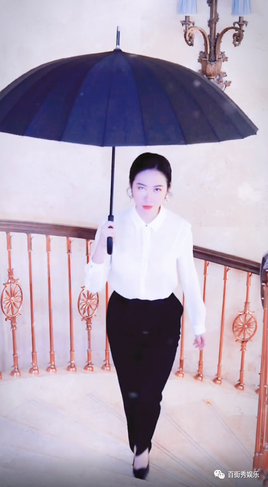 变装后的叶璇撑着一把黑伞,换上了白衬衫和西裤,再加上高跟鞋,整个人的气场都不一样了,眼神犀利坚毅瞬间化身女强人。