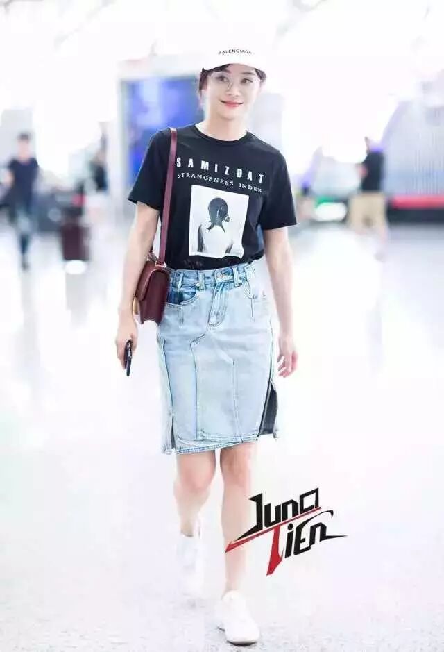 袁姗姗的印花黑T+侧边开衩牛仔裙