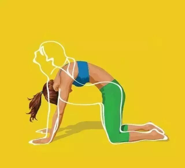 3.呼气,慢慢拉下尾骨和头部,使背部反拱,小腹内收,眼睛看向收紧的小腹。