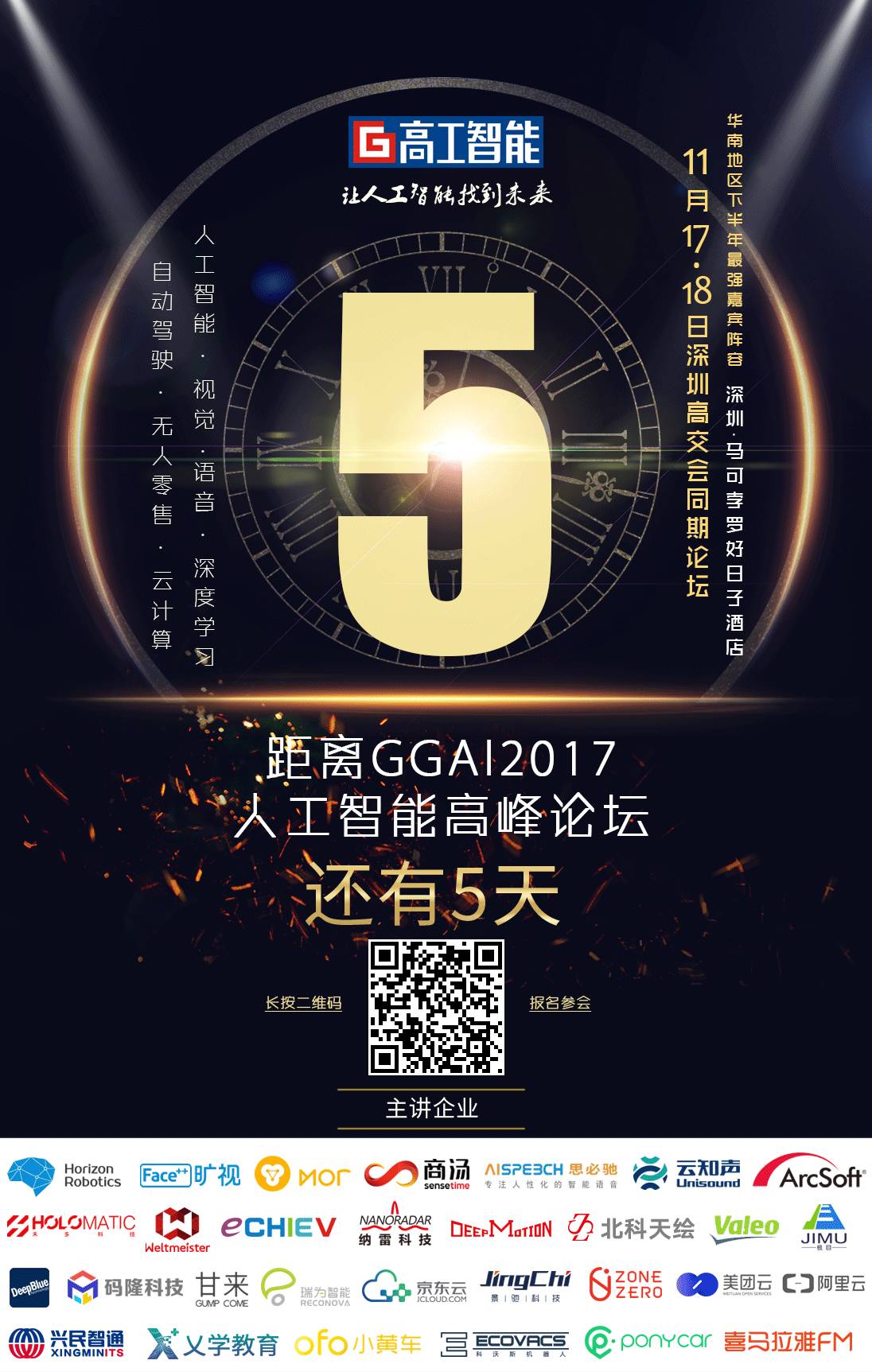 距离GGAI2017人工智能峰会开幕还有5天(11月17日-18日,深圳马可孛罗好日子酒店),本次峰会由高工智能主办,邀请到了30多家人工智能及汽车、零售、教育、共享出行、云计算的应用领域创新企业分享未来AI新趋势。(最新会议议程,请点击底部阅读原文链接)