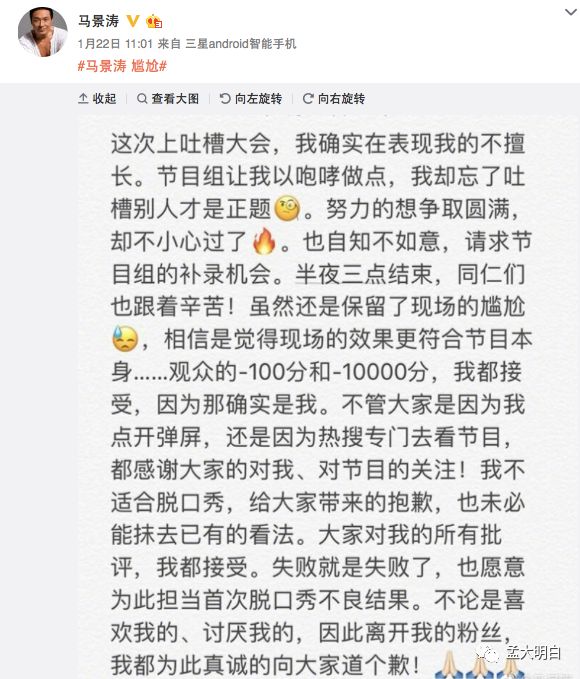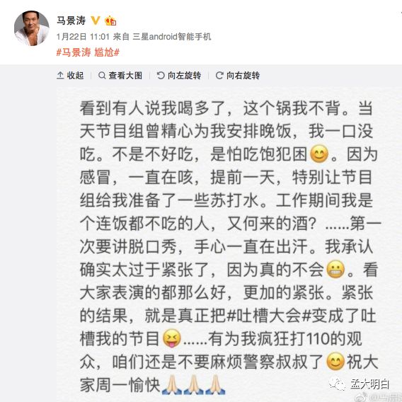 在别人脱口秀的时候,就能看出小马哥很激动,大力拍掌,脸部泛红。事后马景涛发了诚恳微博解释说他已经重录,并没有喝酒。