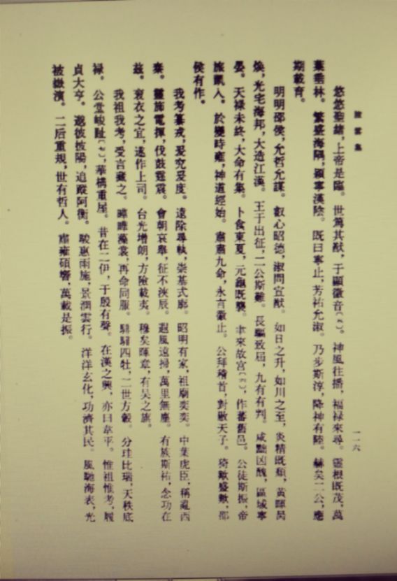 悠悠圣绪,上帝是临。世笃其猷,于显徽音。神风往播,福禄来寻。灵根既茂,万叶垂林。繁盛海隅,颖宁汉阴。既曰宁止,芳祐允淑。乃步斯淳,降神有陆。赫矣二公,应期载育。