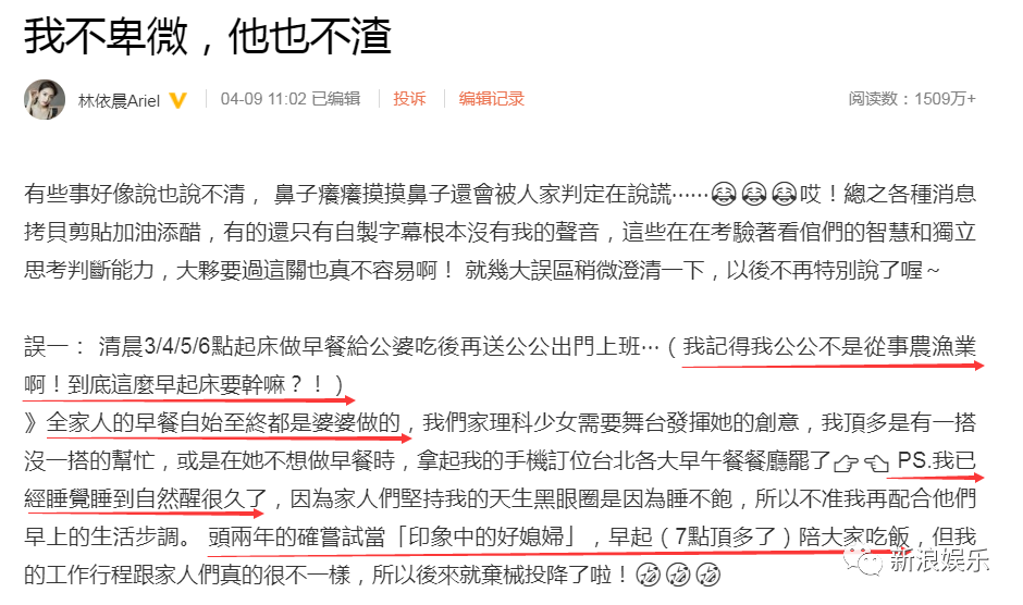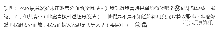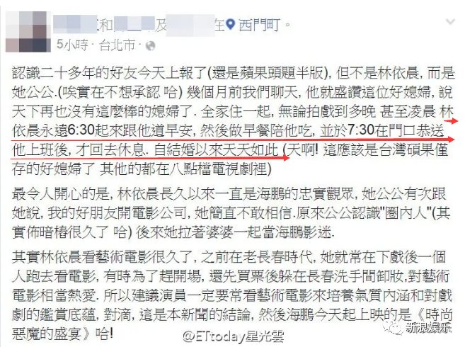 咋的?林依晨活得很窝囊? 新浪娱乐 港台女星 2021-04-09 23:14:01 1526 创作不易,用心坚持,欢迎请BaGua喝几杯爱心咖啡!打赏并支持本文 打赏并删除本文 谁能想到,林依晨的热度能持续这么久,今天还上了两个热搜。林依晨的新闻呢,时间线有点长,别着急,我们好好捋一捋。2019年7月,林依晨宣布停工备孕。林依晨的经纪人对此的态度是:推掉的片酬可以盖几栋楼了。在外界看来,林依晨为了怀孕牺牲很多,付出很多,一些让人瞠目结舌的小道消息更让人确信这一点。此前有八卦消息称,婆家为了要孙子,让林依晨生吃田鸡,据说这样可以改善女性的体质,怀孩子的概率也会高点。但是一年半过去了,林依晨一直没有好消息,台媒坐不住了,在上个月的某次活动中问了林依晨和生子有关的问题。3月17日,林依晨在接受采访时被问到生子问题,她的说法是:有任何你想得到的方式,我们都试过了。后来又被问到是不是非当妈不可,林依晨回答:这会是我蛮重要的旅程,我比较谨慎对待。此话一出立马被热议,有一部分网友恨铁不成钢,觉得林依晨有些卑微,随后大家开始复盘林依晨这段婚姻,发现林依晨这段婚姻有太多值得拿出来说的点。比如网友扒出林依晨早前录制《康熙来了》,小S说林依晨当初被林于超打动是因为“我不在台湾的时候,你随时可以回娘家去住。”对此林依晨没否认,还说她的公公也是这么说,这让她觉得整个家庭氛围都很对。蔡康永当时满脸写着问号,为什么“随时能回娘家”是一句很动人的话啊?我想这大概也是广大网友的心声了。然而一些网友重看那期《康熙》发现林依晨在这段婚姻中,比我们想象得更小心翼翼。小S问林依晨有没有在老公面前放过屁,林依晨的回答是“房外的空间很大,我们可以跑起来!”同时又有网友翻出林依晨公公好友的社交动态,上面写着:林依晨公公盛赞这位好媳妇,因为林依晨永远6:30起来跟他道早安,然后做早餐,再陪着公公一起吃,并于7:30在门口恭送公公上班。该友人还提到了这就是林依晨的日常“自结婚以来天天如此”,并非是一时心血来潮。这一段内容啊,首先要说的是林依晨的作息问题。前两年林依晨的作息时间就被扒过一轮,她自称是“小老人作息”,好友也证实她,不拍戏的时候每天早上五点起床。晚上不熬夜,十点之前就会睡觉。因为有这档子事,很多网友觉得林依晨每天6:30起床并不夸张,毕竟她的作息时间在这个范围内。其次台媒之前确实也有拍到林依晨陪着公公婆婆一起外出用餐,用餐期间精心照顾。也有被拍到陪着公公婆婆一起遛狗。以及今天大家翻出了疑似林依晨送公公出门上班的照片,随即上了热搜。综上,一部分网友觉得林依晨结了婚之后有些卑微,怎么说都是个明星啊。谁知在大家热议的时候,林依晨站出来回应了,今天上午她发了一篇长文,标题是《我不卑微,他也不渣》。她在长文中澄清了几件事,首先没有很早起床,早餐都是由婆婆在做。林依晨说她已经睡到自然醒很久了,并且不否认之前确实尝试做过两年“好媳妇”,但也只是每天7点和大家一起吃早餐而已,后来就不这么做了,因为工作性质比较特殊。其次表明老公人很好,没有什么歪心思,独自在LA工作的时候没有招蜂引蝶,只是养了一只小老鼠,并晒出了照片。第三,说清了“回娘家住”这件事。林依晨称这句话的真实意思是指“想回娘家住几天都没关系”。但老公回台湾的时候就尽量不回娘家,因为老公会想她。第四,提到了不在老公面前放屁这件事。林依晨说她当时是尬笑,真实情况是有,以及老公开玩笑说林依晨会用臭屁攻击。第五,是婆家为了抱孙子让她吃生田鸡的问题。林依晨说她最爱的食物是“青蛙下蛋”,也就是珍珠芋圆一类的东西,绝对不是生的青蛙,也从来没有吃过。最后林依晨澄清了“卑微豪门媳妇”的说法。她说自己嫁的不是豪门,而是“好门”,夫家没有对她有任何苛刻要求,对她像亲生女儿一般疼爱。至此,林依晨这件事由她本人站出来一一进行了澄清,一部分网友依旧觉得林依晨这么一二三四列出来澄清,有些此地无银三百两;另一部分网友认为人家正主都出来回应了,还想怎样?散了散了吧。谁也没有想到的是,一直风评很好的林依晨会陷入到这样的舆论中,大家不禁开始想,林依晨到底是个什么性格啊?怎么会有这档子事出现呢?其实她自己很早就总结过,她是典型的“服务型人格”。林依晨的这种性格和她是家中长女有关。林依晨的父母在她很小的时候就分开了,林妈妈独自抚养她和弟弟长大,对林依晨教育严格,希望她能成为一个有担当有责任心的姐姐。林依晨曾在《快本》上说,很小的时候妈妈就教育她,不能迟到、不能在同一问题上犯两次错误、要永远真诚对人……以至于林依晨长大后回想儿时的生活,都觉得妈妈在她人生中担任很重要的角色,她对妈妈的感觉是“敬畏和服从”。因为妈妈很好强,为了把她和弟弟养好可以一个人打好几分工;又因为妈妈从小严格管教林依晨,导致林依晨养成了一个能自己担着就绝不麻烦其他人的性格。最能说明此性格的例子是林妈妈有次突发脑中风,林依晨一个人把妈妈送到了医院,没有给任何亲戚说,一切担惊受怕都选择一个人扛。这种性格伴随着林依晨长大,而随着林依晨年纪的增长,她越发不愿意麻烦人,所以就越发会照顾别人,慢慢地变成了一再为别人服务,不停反思自己,总觉得