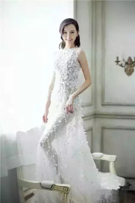 这些小花里面应该就属赵丽颖最年轻了,褶皱大裙摆婚纱,像一朵盛开的白花,干净纯洁。波浪卷发女神范十足,非常符合赵丽颖单纯的形象。