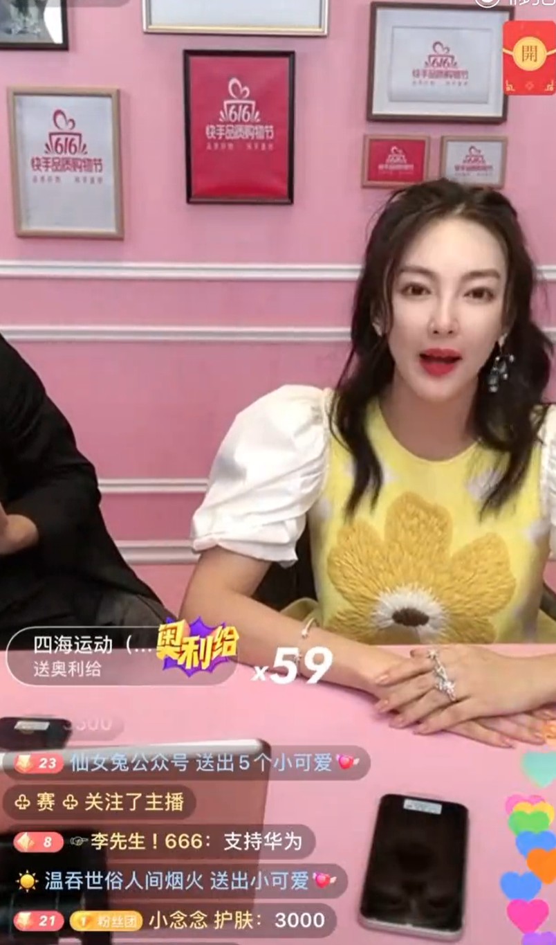 在最新一次的快手直播中,她和主播辛巴一起搭档卖货。