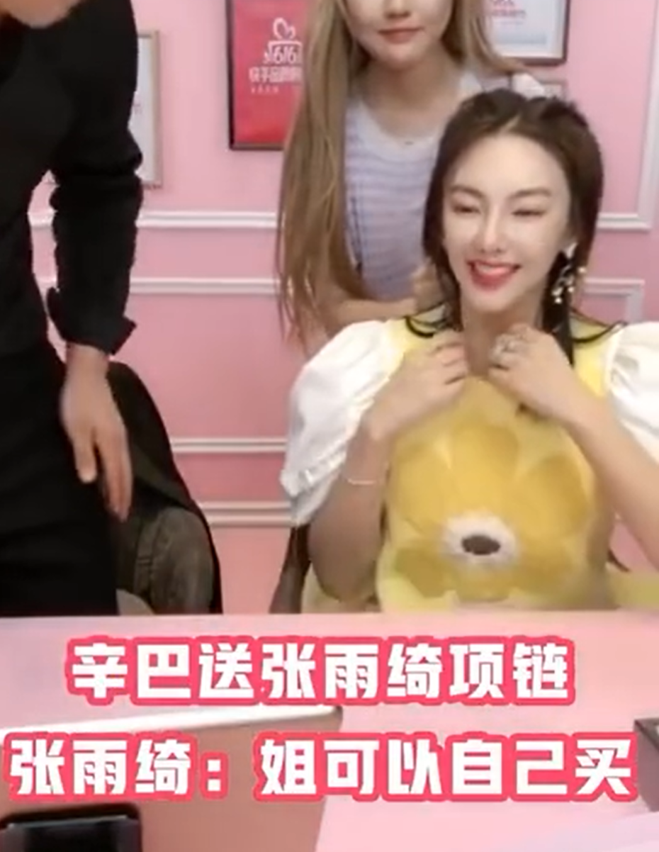 又过了一会,辛巴在卖项链,张雨绮试戴。