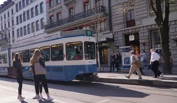 “苏黎世历史悠久的文化历史建筑,班霍夫大街上来来往往的行人们时尚漂亮