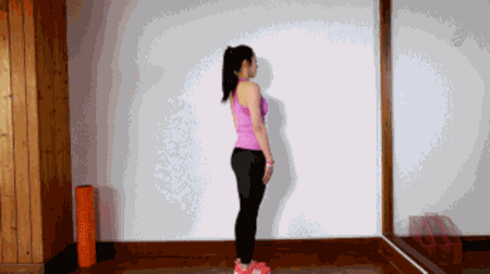 第一步:笔直站立,双脚与肩同宽,双手背后合十并拉伸。