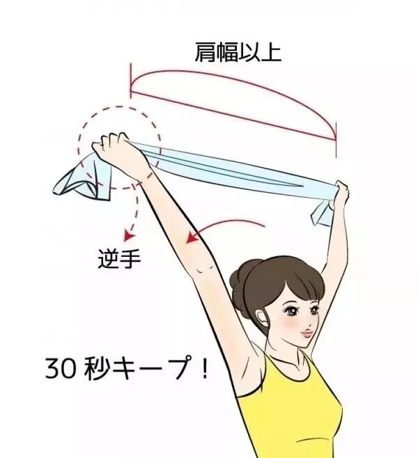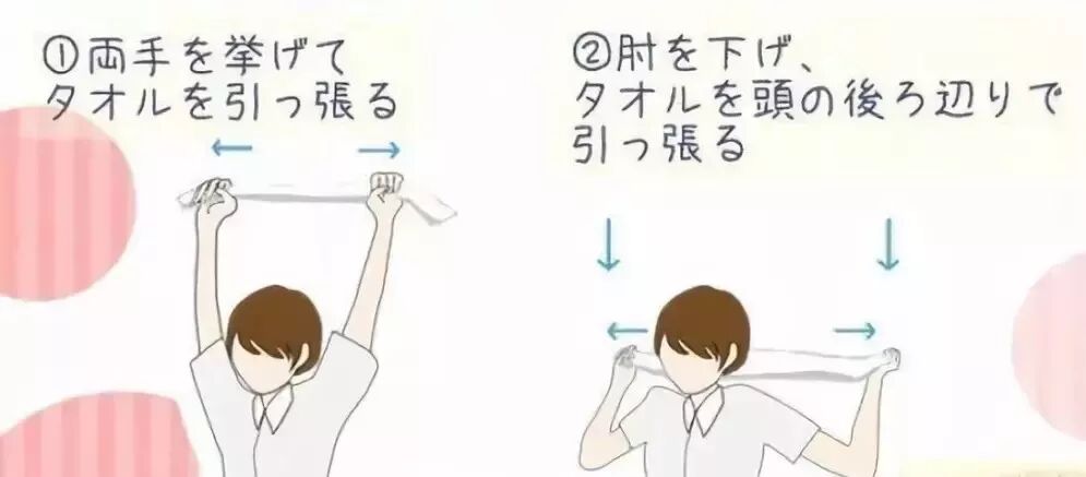 或者也可以双臂伸直握住毛巾,并将毛巾向左右两边拉,接着在移到后脑的位置也是将毛巾向外拉开,这样上下交替重复 3~5 次即可。
