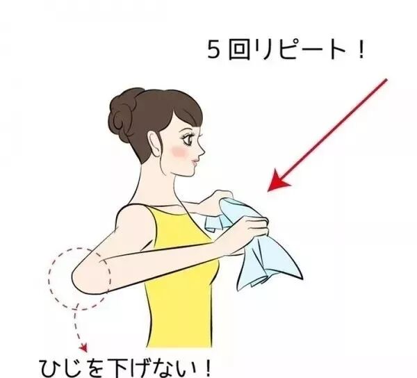 第二步:将毛巾移到前方,手心向下握着两端并且将手臂从斜上方向胸前拉近,重点是手肘不要下垂!重复 5 次即可。