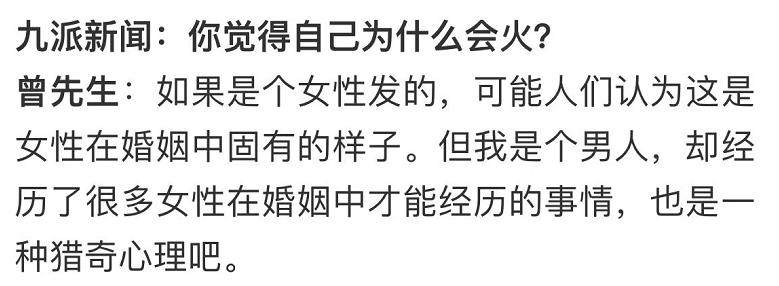 林志玲首谈离婚,公开婚姻失败真相!网友怒喷:活该沦落成这样! 职场知识谋略 内地女星 2022-12-23 18:00:54 458 创作不易,用心坚持,欢迎请BaGua喝几杯爱心咖啡!打赏并支持本文 打赏并删除本文 作者:不山大叔 来源:不山大叔(ID:ouba798)。最近,远嫁日本的林志玲产后首次在台湾现身!在新书发布会现场,她身穿一袭长裙,披肩长发显得十分温柔。说到自己的婚姻和与儿子的生活点滴,她几度哽咽落泪。此前,黑泽志平家暴、出轨的传闻甚嚣尘上,林志玲一直没有出面回应。这次,她突然高调宣布回台湾发展,理由是要照顾年迈的母亲。而黑泽志平也回应称不会随林志玲搬到台湾。才结婚三年就两地分居,让网友们纷纷猜测,林志玲是不是离婚了。但说回来,婚姻是他们自己的,旁人不好多猜测。最让山叔意外的是,不少网友说林志玲结婚后没有少女感了,状态远不如从前。他们得出了一个结论:林志玲被毁了!无独有偶,刚生完二胎不久的郭碧婷也被嘲脸上胶原蛋白严重流失。两个人一个曾经是亚洲第一女神,一个被称为国民女神,如今却被嘲颜值,山叔感到无限唏嘘。在网友看来,正是生孩子毁掉了她们的颜值。戏谑的是,当男明星因为带孩子状态不佳时,网友却纷纷表示鼓励。同样身为父母,同样身为明星,仅仅是因为性别不同,待遇就千差万别。而类似的事情,在互联网不断上演着。01最近,山叔看到了一个概念叫“妊娠伴随综合征”。指的是丈夫在妻子出现妊娠反应时,也会出现随之出现这样的症状;当妻子的妊娠反应结束后,丈夫的症状也会随之消失。郑钧就曾在节目上透露在刘芸怀孕期间出现了这种症状。 值得讨论的是,男人出现这种症状,就有人夸他是好男人,爱自己妻子才会这样。他们什么都没做,就已经获得了鲜花和掌声。但事实上这种情况对男性来说很少,不及女性生育痛苦的千分之一。类似的事情屡见不鲜,某视频平台上的百万网红阿爆在家全职带娃,被诊断出了中度焦虑和抑郁。 他在这期间悲观、易怒,愤怒的面目像一头野兽,常常吓哭孩子。而抑郁的根源在于为了孩子,他从原本光鲜亮丽的模特沦为了灰头土脸的奶爸。互联网上对他一片赞扬,瞬间冲上了热搜。山叔也十分敬佩他为家庭的付出,但这不正是大多数宝妈的真实写照吗?下面这个视频看得山叔胆战心惊,视频中宝妈独自带娃,由于腱鞘炎和生理期,身体十分不舒适。但孩子还一步一步紧跟着她,崩溃的她只能蹲在地上,对孩子怒吼。 不同的是,阿爆没有经济压力,家中有保姆帮忙,还有妻子的理解和体恤。仅仅是带孩子,就让他身心俱疲,走向抑郁。他们作为父亲,仅仅承担了一部分痛苦就被讴歌,而这却是更多妈妈们稀松平常的生活。02可笑的是,有些男性并没有因为这样的宽容对妻子多一丝理解。即使亲眼见过妻子生育的样子,还能把这样的痛苦拿来当作谈资。某百万博主的老公看到老婆生产的样子后,居然这样描述:“让老公陪产就相当于劝他离婚!”“那么大一滩的血,整个场面很血腥,我都要吐了。”“还要剪脐带,滋啦滋啦的声音,听得我鸡皮疙瘩都掉一地。” 从他的眼中,丝毫看不到对妻子的心疼,有的只有对这段经历的厌恶。而女性面对的苦难远不止生育,更难的是之后的哺乳、抚养。但在崩溃的边缘,她们面对的是事不关己,甚至嫌自己烦的老公。 明明只需要承担一部分责任就能被叫做好爸爸,可大多数男性选择了视而不见。山叔有个朋友曾经坦言,带孩子的时候想过从楼顶上跳下去。自从生下孩子,她就辞职当起了全职妈妈。每天带孩子、做家务。丈夫却责骂她整天无所事事,连孩子都带不好。听到这句话的她心里好像撕开了一刀口子,深可见血。如她所说,压垮她的不是身体上的累,而是丈夫的不理解和冷眼旁观。03但比起现实生活,互联网上的现象却十分荒谬。网上的男性十分会利用大众的宽容,开始伪装全职奶爸来愚弄大众、博取流量。还记得贵州毕节那个哭诉自己带孩子辛苦的上门女婿吗?在视频中,他称自己每天带孩子,孩子还不跟自己姓,身上只有不到200块钱。而他之所以能火,正如他自己所说,是因为猎奇心理。 因为女性为孩子牺牲自我是生活中极为普遍的情况,而男性育儿则十分稀少,更有新闻价值。正应了互联网上那句流行的话:“性别互换,评论过万。”奇怪的是,舆论在追捧男性育儿的同时,试图扼杀女性的生育之苦。前段时间,一个孕妈记录自己怀孕期间身体变化的视频被下架了,原因是露出了妊娠纹,影响用户感官体验。最后,她的账号甚至被封禁了。 说实在的,山叔承认那些纹路肉眼看上去并不算美好,但那是妈妈们身体上最真实的生育痕迹,为什么要遮掩呢?这件事和互联网上对育儿男性铺天盖地的宣传对比,山叔突然感受到了一股可悲:男女角色互换居然有如此多的关注度,即使很多内容都是演的。比如,这位曾先生亲口承认自己的视频有表演成分。而这样的事情早已不是孤例。比如当初某短视频平台上吸粉百万的“奶爸小强”,就被扒出孩子、老婆都是假的,在家辛苦带娃都是剧本。女性为生育的付出成了他们的流量密码,分走了对宝妈们本就不多的关注。04山叔写下这篇文章,并不是宣扬恐婚恐育,或是谴责男性,而是恳求大家对宝妈们多一些理解。她们的困境是互通的,一旦有了孩子,就被捆绑住了一生。生理上,要承受生育的一系列痛苦;心理上,得不到家人的理解。没