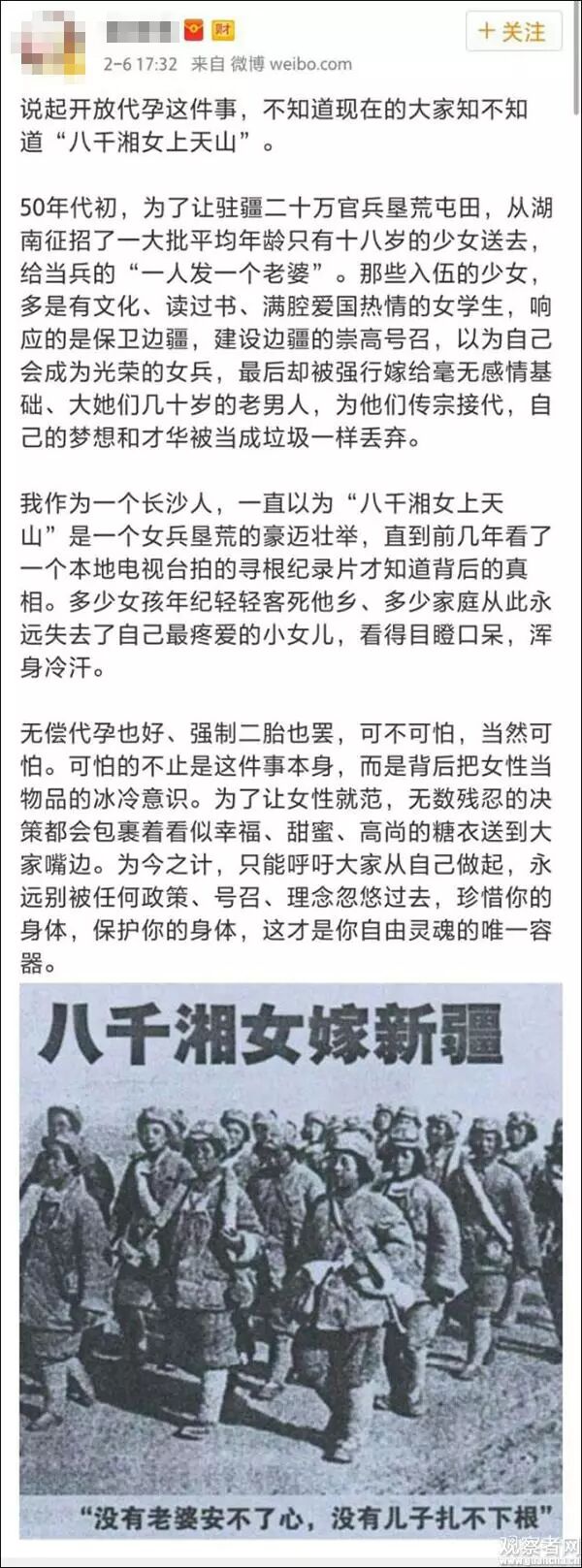 因为传播总会不自觉地省去历史的细枝末节,甚至反过来,只传递历史的细枝末节。对于“八千湘女上天山”,遍地转发的总是那张“没有老婆安不了心,没有儿子扎不下根”的报道截图。