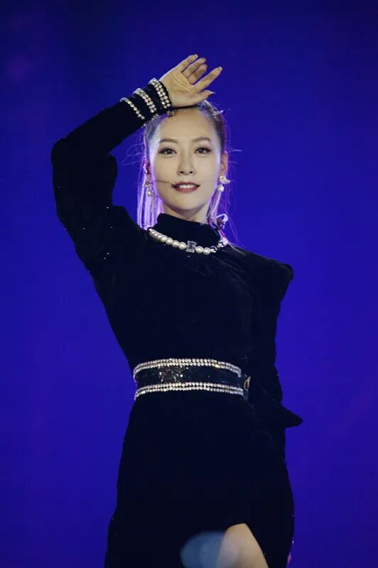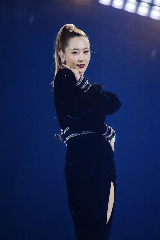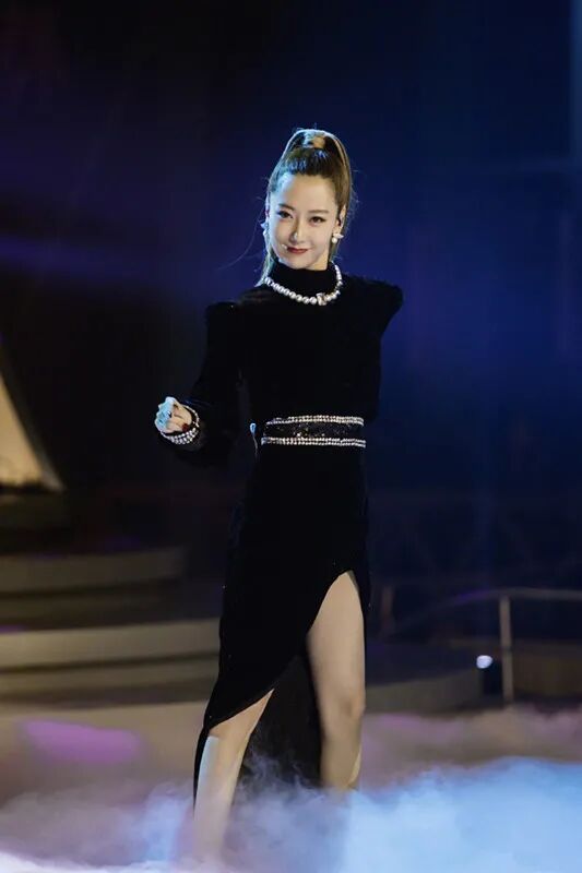 黑色丝绒裙半高领设计可以很好地修饰白冰的天鹅脖颈,与立体感十足的垫肩设计形成一体,显得霸气十足,女王范很强大。发型也是简单的长发扎高马尾造型,稍稍渲染成黄色的发色打破黑色的单调沉闷,为舞台增添色彩和注入了活力,同时减龄效果满分哦。