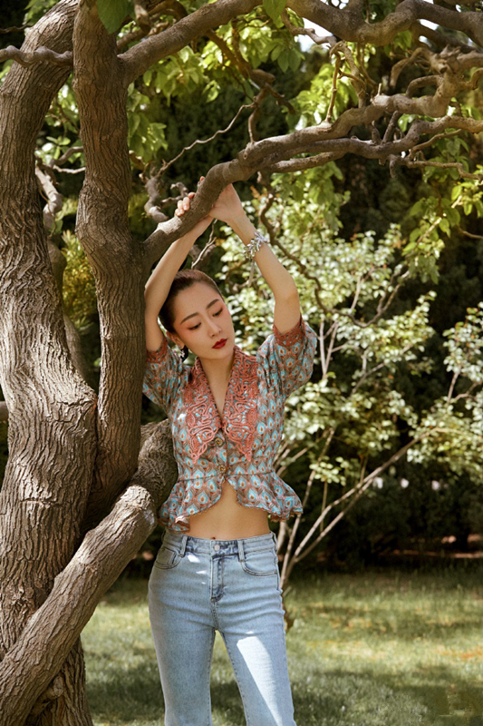 34岁复出的白冰也越来越放得开了,大胆秀出苗条性感的好身材。短款印花上衣+牛仔裤,露脐式的短款设计大方展露腰线,露出光滑的腹肌彰显小性感,这吸睛亮眼的小蛮腰让小编实名羡慕了,不得不说34岁的白冰状态保持得也太好了吧!上衣翻领的镂空蕾丝元素极尽女人的优雅温婉气质,V领的设计能很好地修饰脸型和身形。
