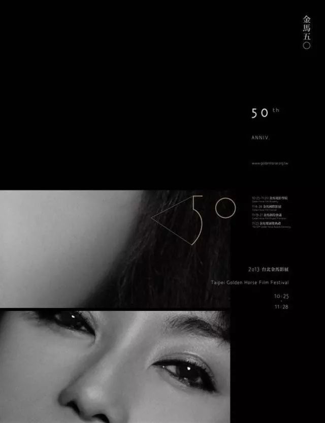 第50届金马奖海报设计极其简单。黑白底色上,聂永真用两条线条勾勒出类似放映机投射光线的效果,搭配「50」字样更显韵味悠长。< 符号,既像放映机,同时也有一点像场记的工具场记板;5比较像一匹马的简化形状,0看起来则是一个导演筒。