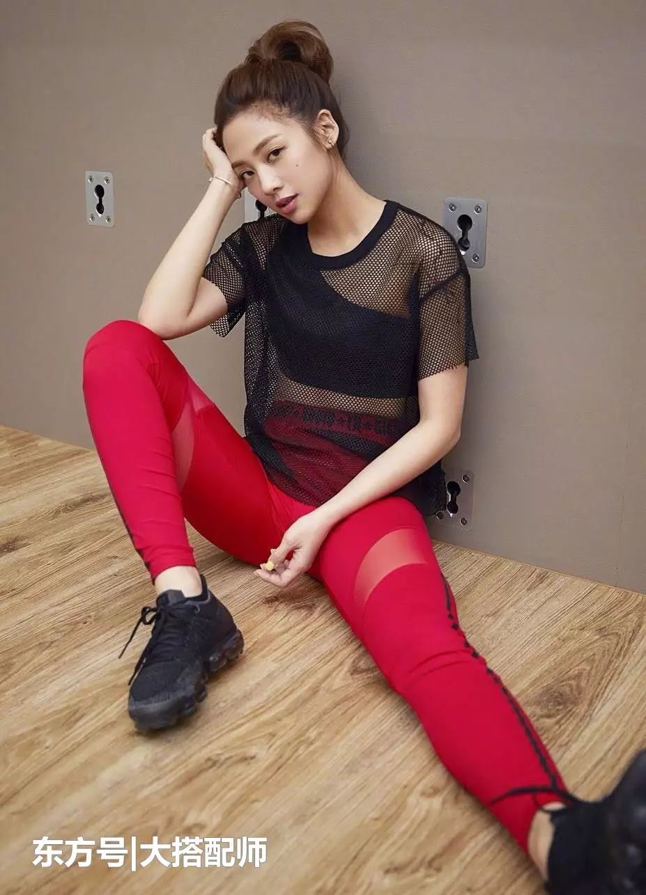 透视网格上衣搭配红色紧身裤,非常狂野的坐姿,这才是那个活泼大胆的鬼鬼嘛。青春张扬,个性十足。