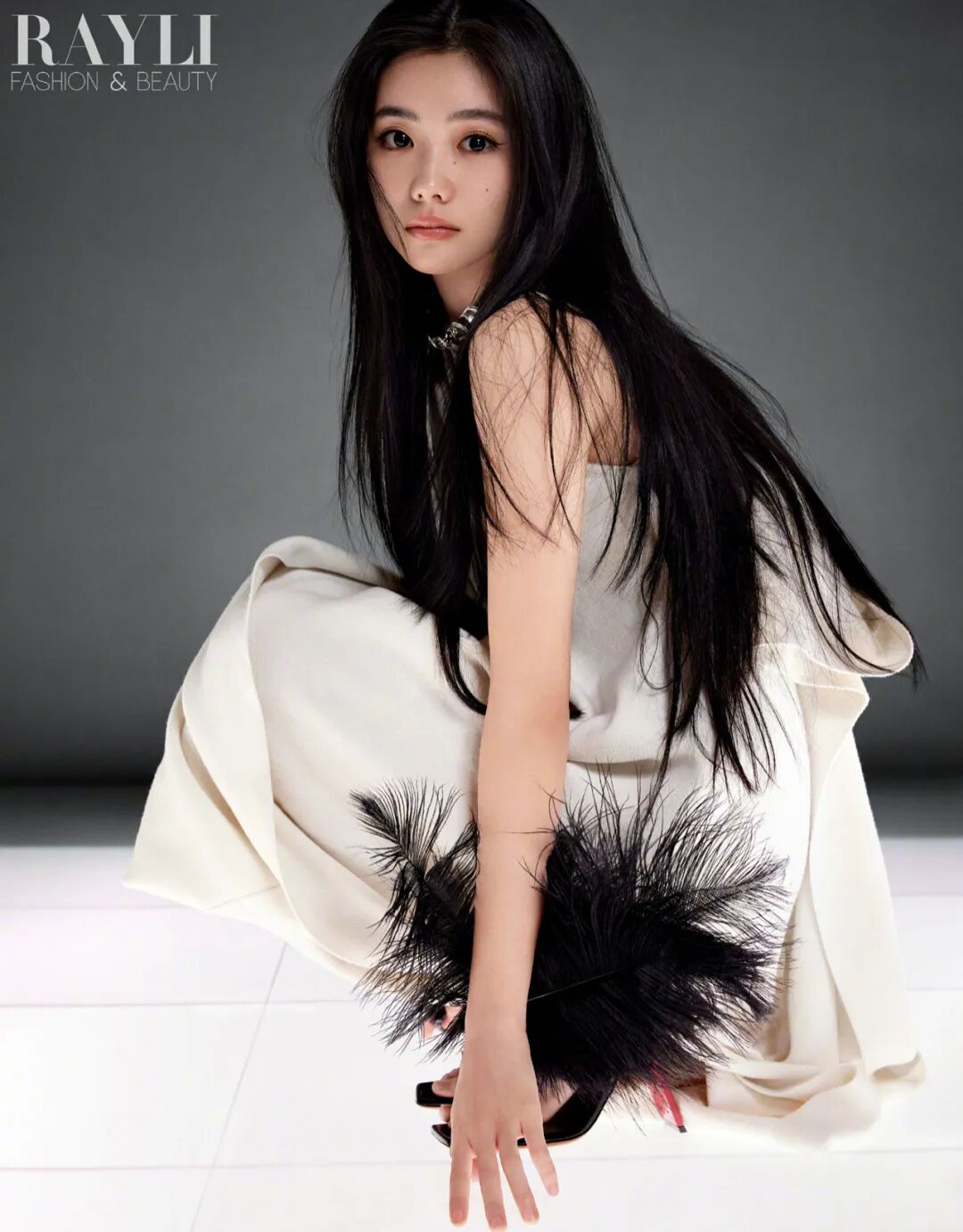 时间退回到3月的某一天,我们在北京东五环的一处摄影棚内见到了刘浩存,她穿一件娃娃领的衬衫、牛仔裤、小白鞋,没有化妆,一头长发瀑布般自肩头倾泻而下。她站在人群里,小小的身体几乎要被因她而起的讨论声湮没,她会安静地倾听,眼神专注地看着正在讲话的人,等各方的意见都充分表达之后,她也会分享她心目中服装的搭配,动作的尺度、造型要怎么摆,以及视觉想要传达的主题。声音不大,但轻柔下也透出一种坚定与主见。