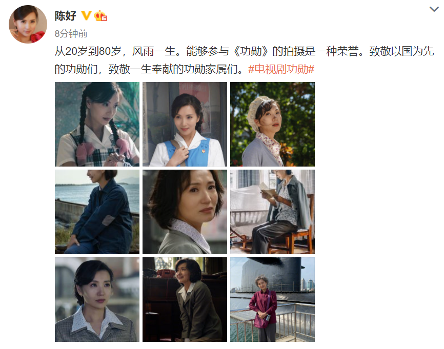 她也发博称,这部戏从20岁演到80岁,能参与拍摄是种荣誉,向功勋们和功勋家属们致敬。