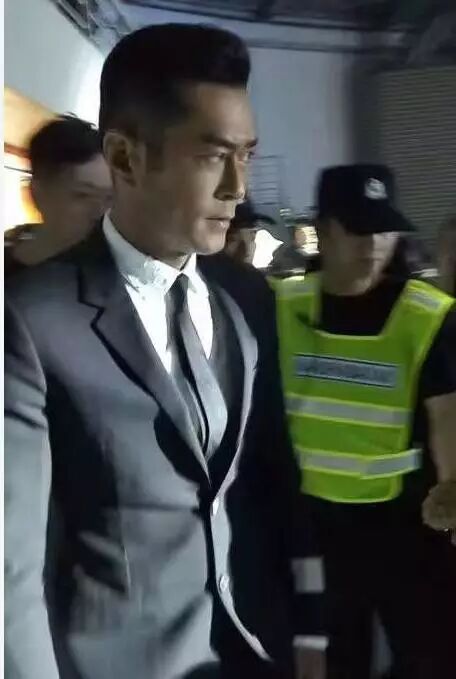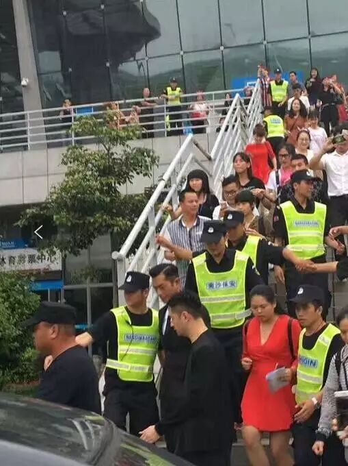 *古天乐在保安众多人的保护下进入南沙体育馆