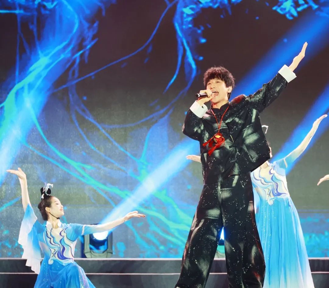 而当后弦登场,那熟悉的旋律重新唤醒观众内心深处的记忆。《那年印象刘三姐》与《下完这场雨》在他独特的嗓音中流淌而出,流行元素与古典文化、民族风情碰撞出奇异火花,在虚实之间构建起一座跨越时空的“情感共振场”。台下观众轻声跟唱,那些关于刘三姐的遥远传说,此刻被赋予了全新的时代气息,仿佛在诉说:经典从不曾被遗忘,只是以新的方式在心灵深处重新生长。