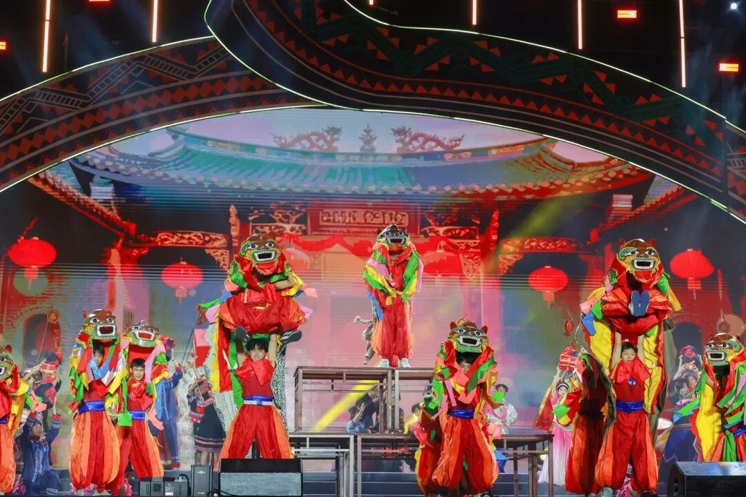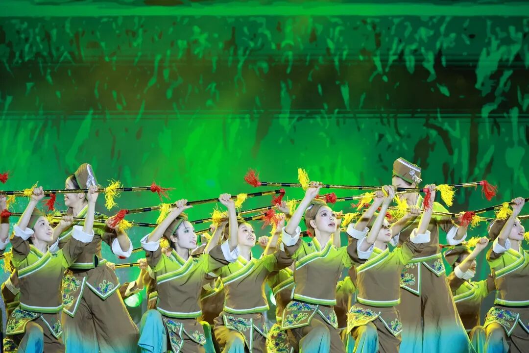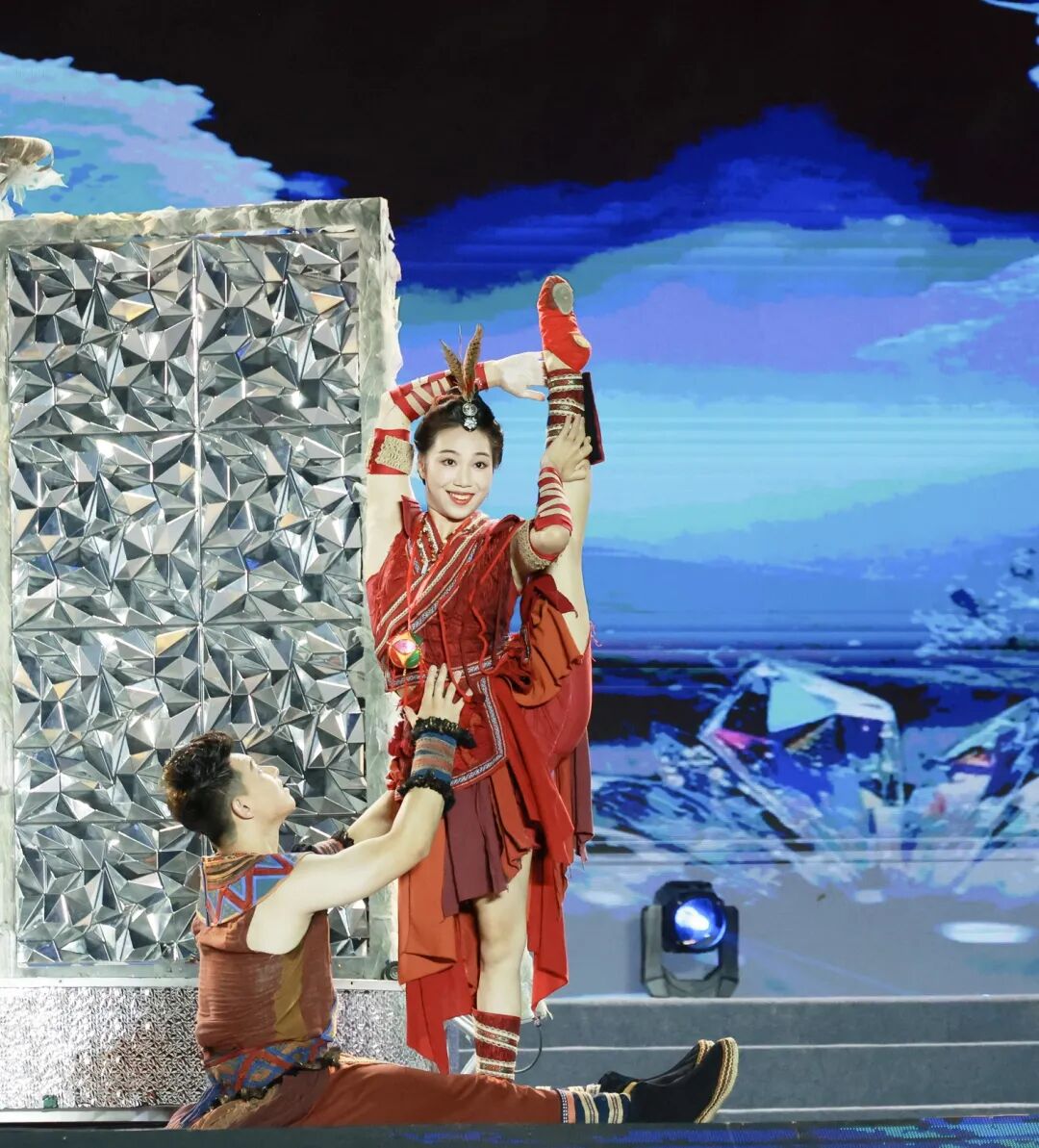 第二篇章“千年古城尽芬芳”则让目光投向历史的纵深。歌伴舞《月圆歌》、杂技《龙水情》、舞蹈《打钱排》吸引了观众们的目光。灯光映照之下,演员在高台上翻转腾挪,长袖舞动如龙行云海,人与竹、力与美在惊心动魄的平衡中交融,惊险与诗意交织出令人屏息的画面。