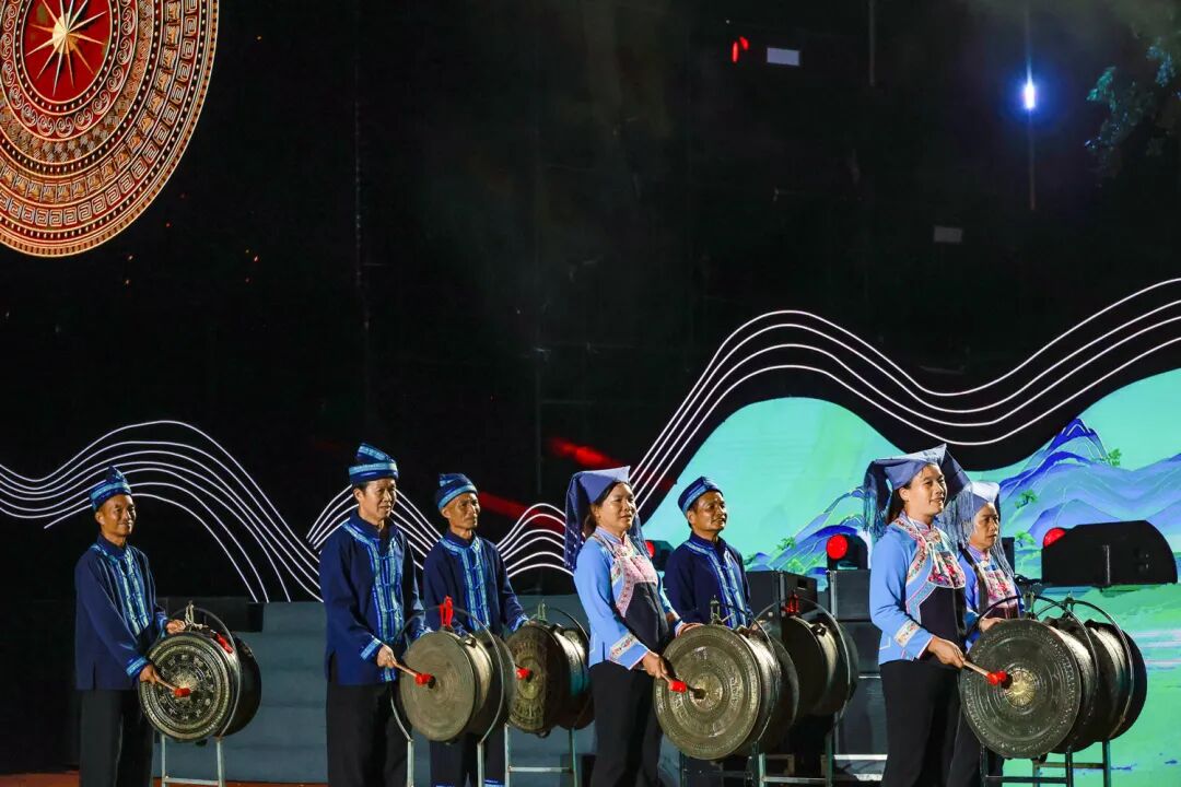 6月30日晚8时,铜鼓演奏拉开了文艺演出的序幕。随着灯光渐次亮起,古老山歌旋律如无形溪流般缓缓流淌而出,舞台上歌者如林,山歌层层叠叠,那声音仿佛来自时光深处,从四面八方涌来,瞬间汇成一片山歌的海洋,穿透了观众席中每一处角落。