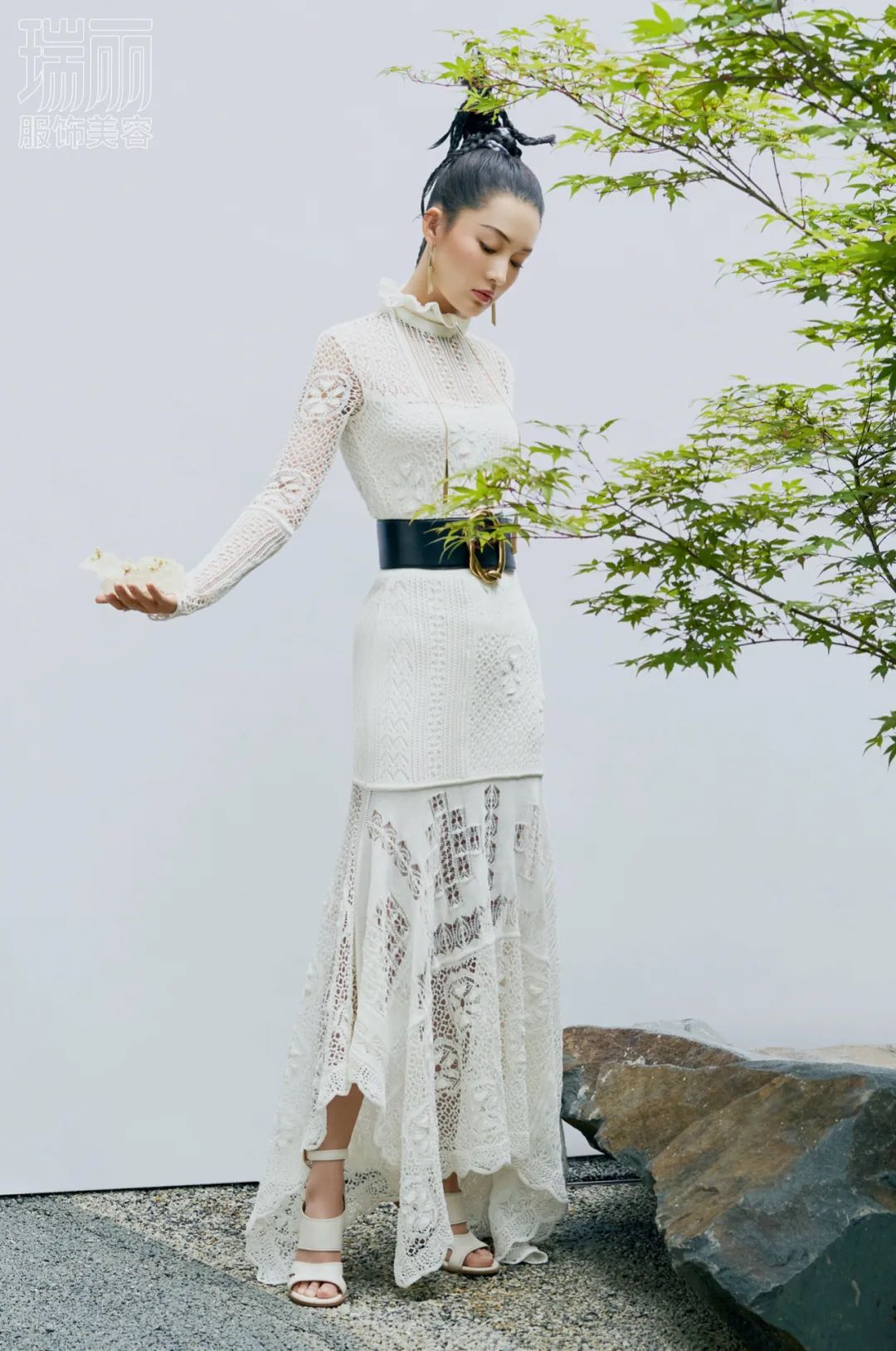米白色蕾丝长裙、白色立体花朵高跟鞋、黑色皮革腰带/均为Alexander McQueen,Couture系列Delilah项链、耳环/均为Boucheron宝诗龙。