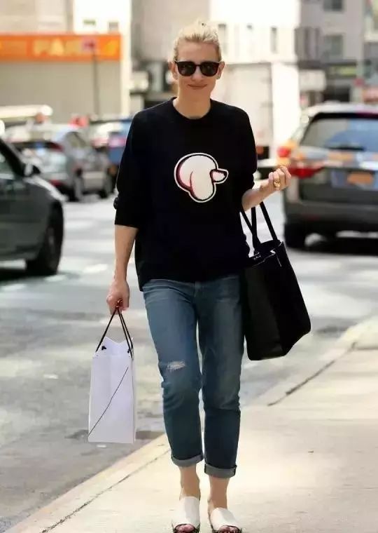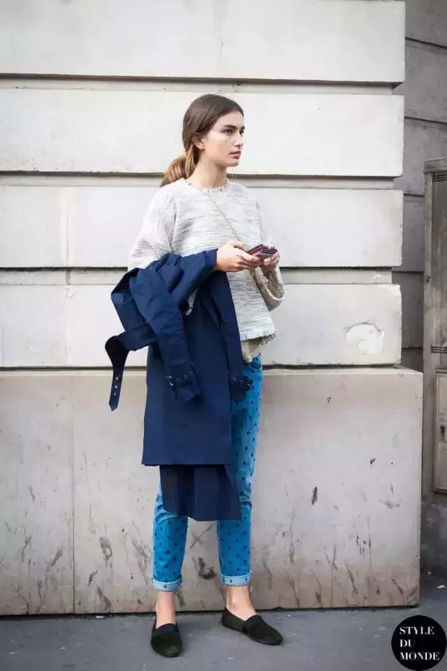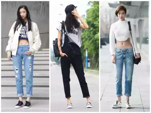 同理,破洞牛仔裤,短靴和褶皱的牛仔长裤显拖沓,九分裤的比例看起来完美许多。