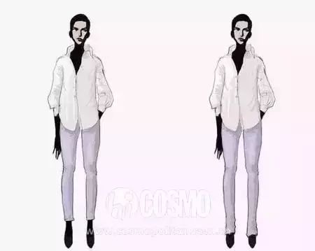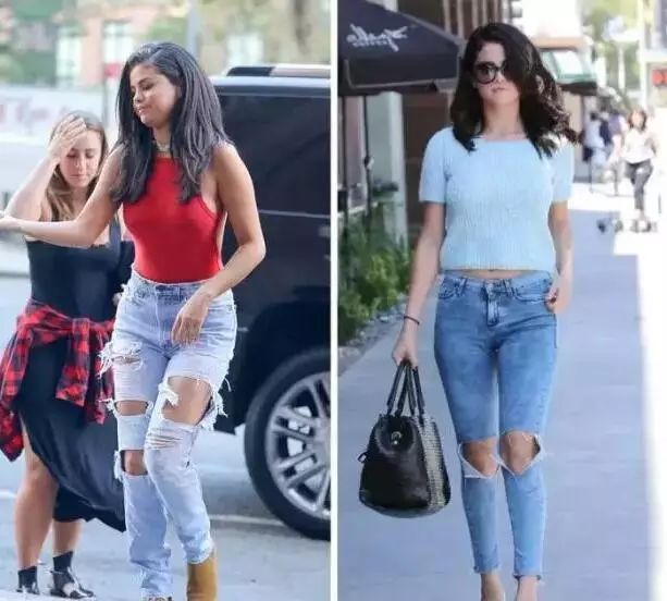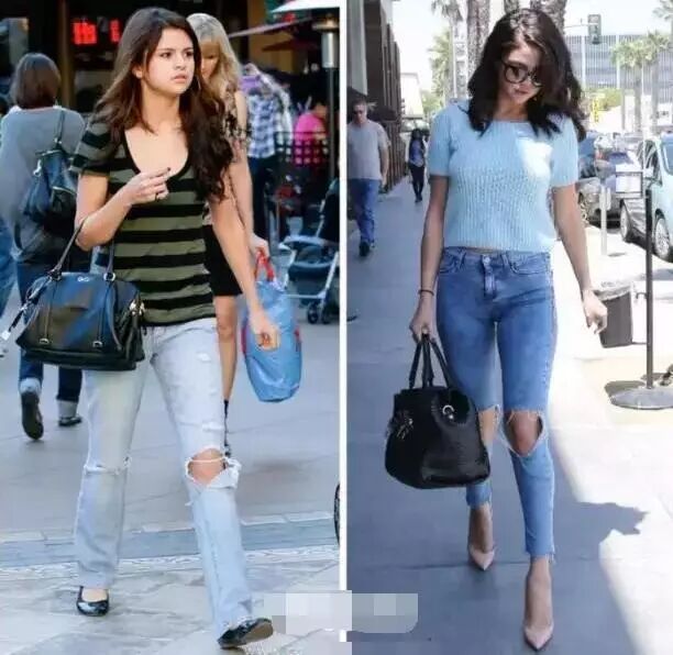 从傻脸娜Selena Gomez这张对比图很明显的看出,穿长裤更容易把视觉重心吸引到下半身;而你换上九分裤时,视线就会上移,自然而然有拉长的效果。
