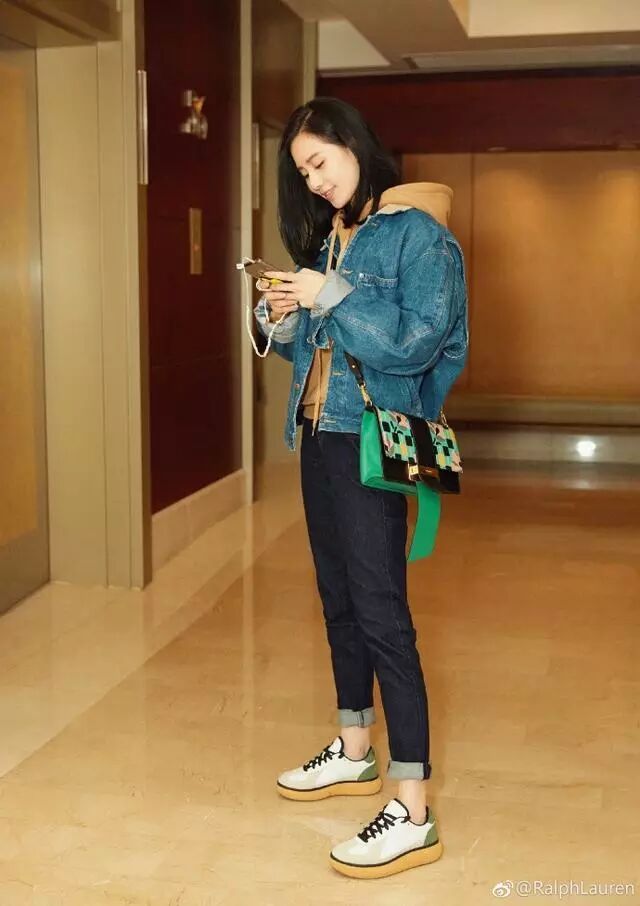 穿着驼色卫衣牛仔外套搭配牛仔九分裤的刘诗诗显得格外的俏皮,挽起裤边随性舒适。