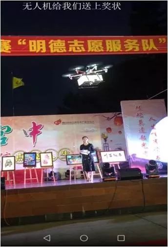 在官窑中学第六届读书节闭幕式晚会上,我校黄铭常校长与北大数研航遥集团张宝华总经理一起揭开了《无人机青少年创客中心》的牌匾。同时一架无人机从舞台后方缓缓升起,引来全场学生的欢呼,无人机准确无误地将“美术类特别贡献奖”奖状放在桌子上,我校领导为这些获奖学生和家长进行了颁奖,无人机再次在校园上空升起,与我们共同见证了这历史性的一刻!