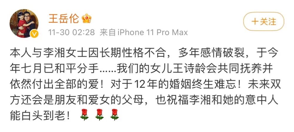11月30号凌晨2点多,王岳伦发了一条微博官宣离婚。