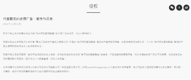 12月12日,刘德华经纪公司亨泰环宇有限公司就此事发布声明函称,刘德华代言“新开荒乳酸菌酸菜”为不实广告信息。