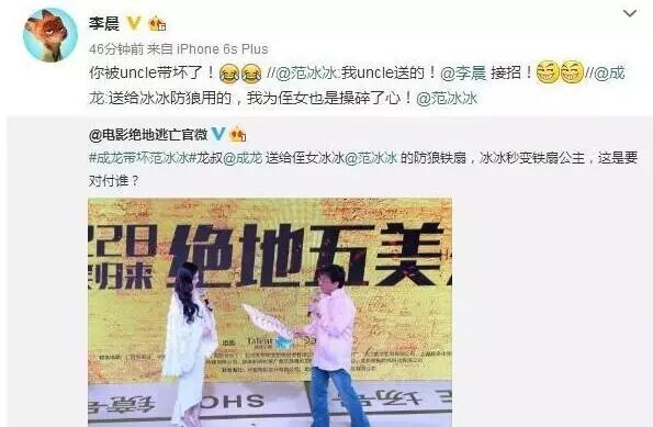 此番获赠防牛铁扇,冰冰乖巧地在微博上向李晨报备,李晨回复得也是相当给力:你都被叔带坏了(潜台词:离坏蜀黍远点)