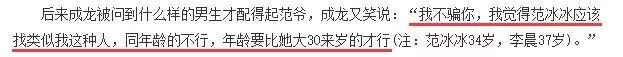 成龙对范冰冰也是一直“钟情”有加,听到范冰冰与李晨相恋的消息,他的内心是拒绝的,甚至说出自己更适合冰冰这种惊人语录。