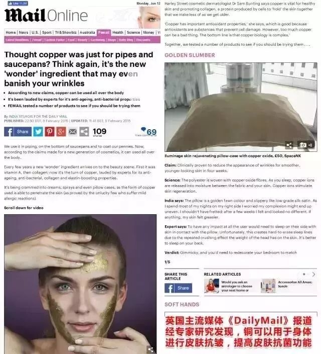 关于铜离子对美容护肤方面的应用,英国主流媒体《每日邮报》早在2015年2月8号就发布过相关研究成果,经专家研究发现,铜离子能够作用于身体让皮肤抗皱,也能提高皮肤抗菌能力。