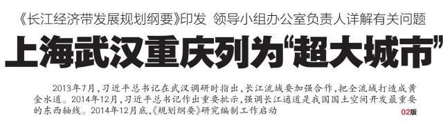 为贯彻落实党中央、国务院决策部署,近日,《长江经济带发展规划纲要》正式印发,将促进各类城市协调发展,要发挥上海、武汉、重庆等超大城市,和南京、杭州、成都等特大城市引领作用的引领作用。