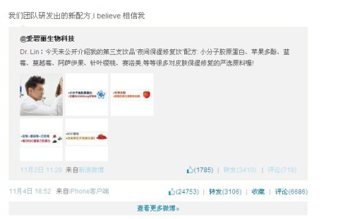 自称“林博士”的林志颖宣传说,“爱碧丽”是“最好的团队和最优良的制造厂开发出的优越商品”,这款产品将“揭开逆生长的秘密”。