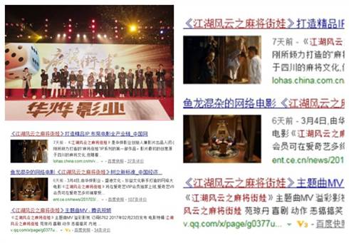 发行公司在门户网站投放了50余篇新闻稿件和100余篇移动端媒体曝光量,为影片奠定了深厚的舆论氛围。而在影片3月4日正式上线后,《江湖风云之麻将街娃》主海报迅速占据北京多条地铁广告位黄金位置和北京国贸户外广告展示位。