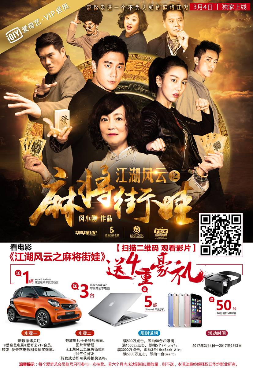 3月6日,爱奇艺官方微博“爱奇艺电影”和“爱奇艺VIP会员”发布了为期6个月《江湖风云之麻将街娃》的抽奖信息。让业内人士震惊的是,奖品并非是常见的明星签名照或是电影道具服装,而是价值不菲的 奔驰Smart、苹果MacBookAir、Iphone7、VR眼镜,不禁让业内人士惊叹出品公司浓浓的贵族气质。