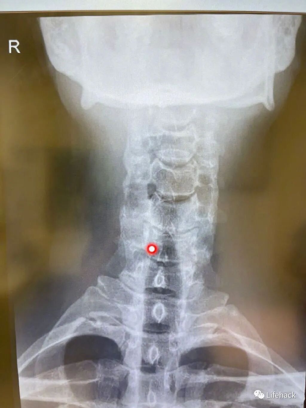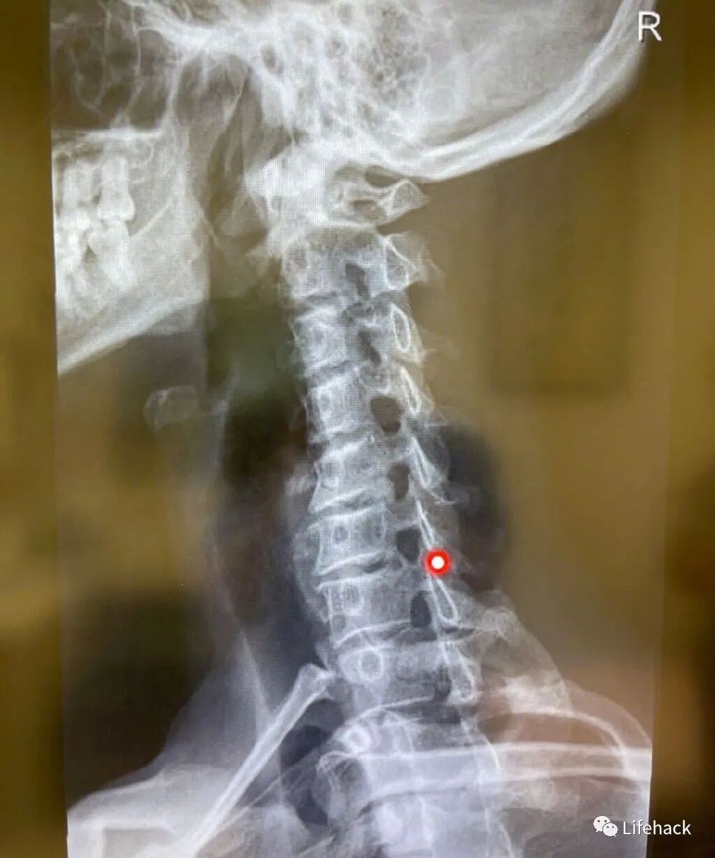 片子中红点的位置应该就是他颈椎出问题的地方,简单直观地不难看出,这个位置就是长期保持低头姿势时,颈椎受压最大的位置所在!