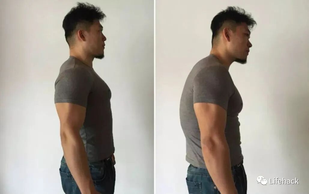 下面这张对比图最直观:左图是正常体态,右边是养成的不良体态,包括驼背、耸肩、头部牵引。