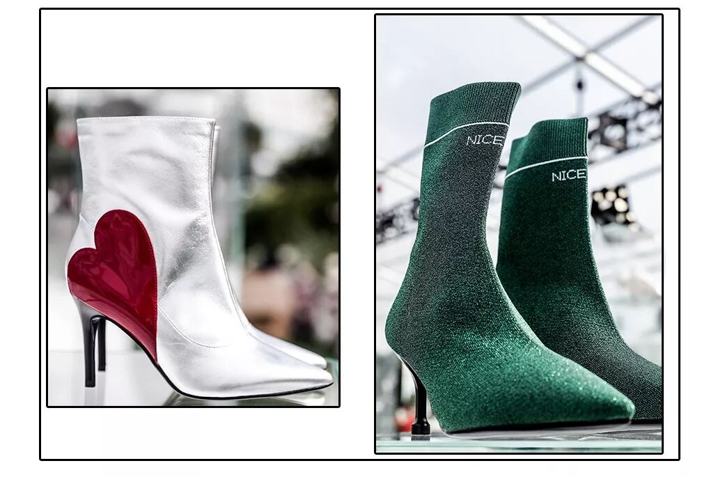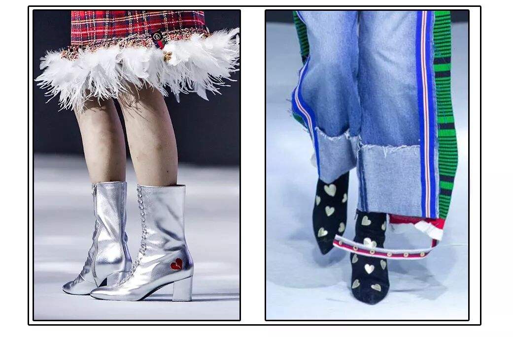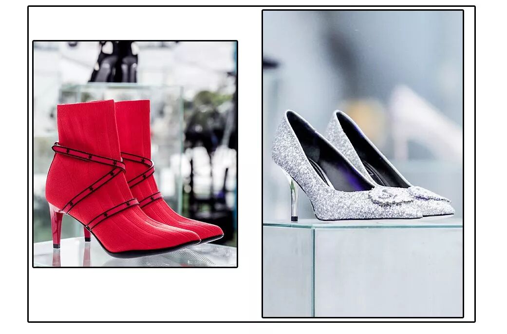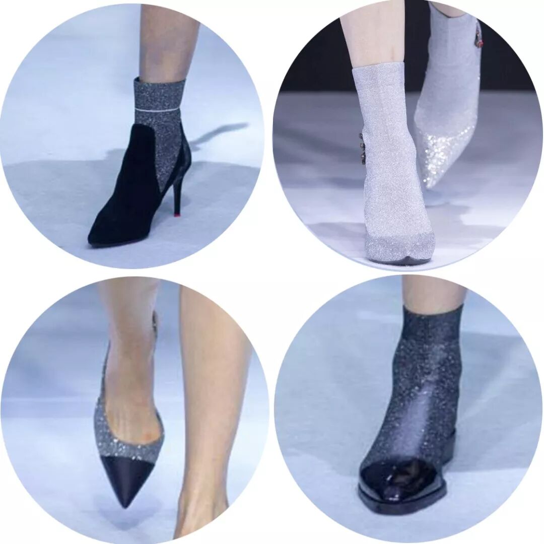 像今年秋冬最流行的袜靴配合着黑色缎面丝绒和漆皮,以及单纯秋冬就可以穿的银色细高跟。▼