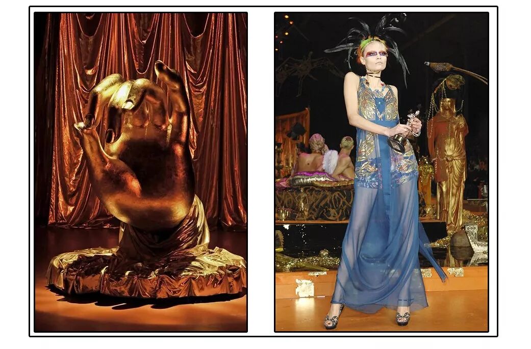 印度风和中东夹杂一起。秀场的佛手取自佛教典故“释迦拈花,迦叶微笑”,不过佛祖的手上,并没有菠萝花。▼