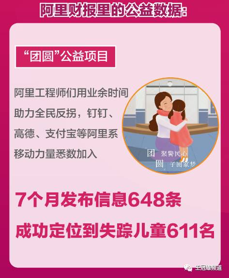 比如阿里工程师用业余时间助理全民反拐,7个月发布信息648条,成功定位到失踪儿童611名;集团每年收入千分之三用于支持公益。