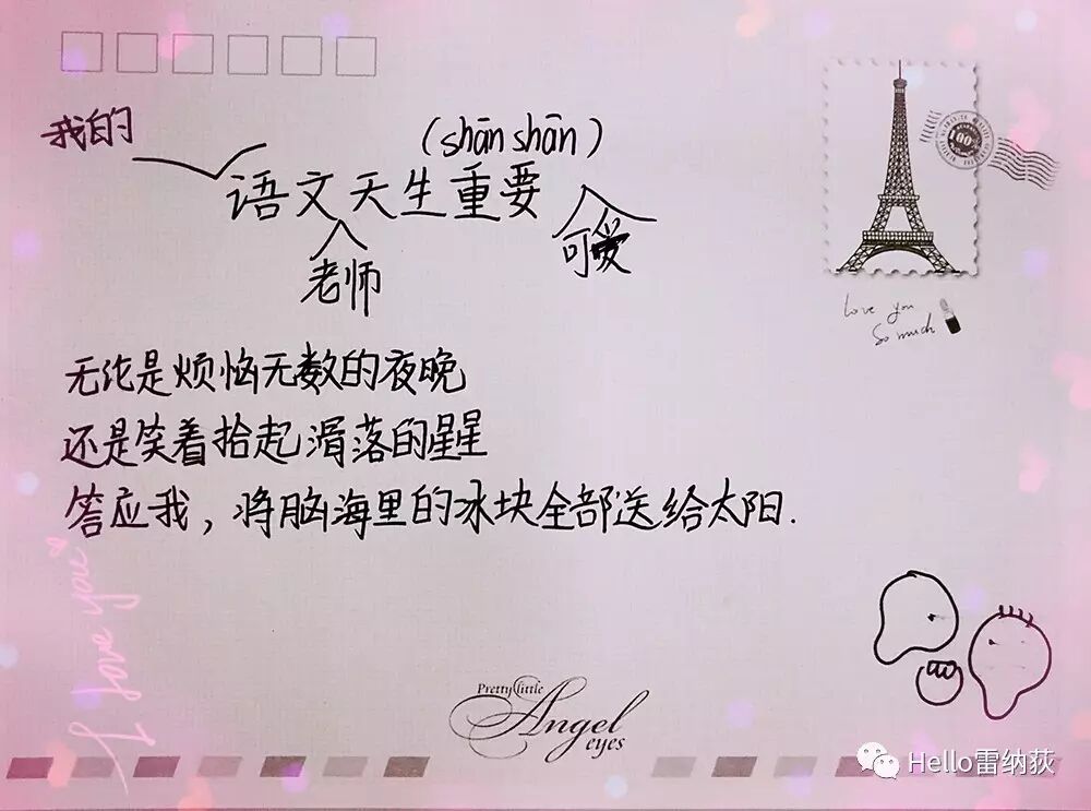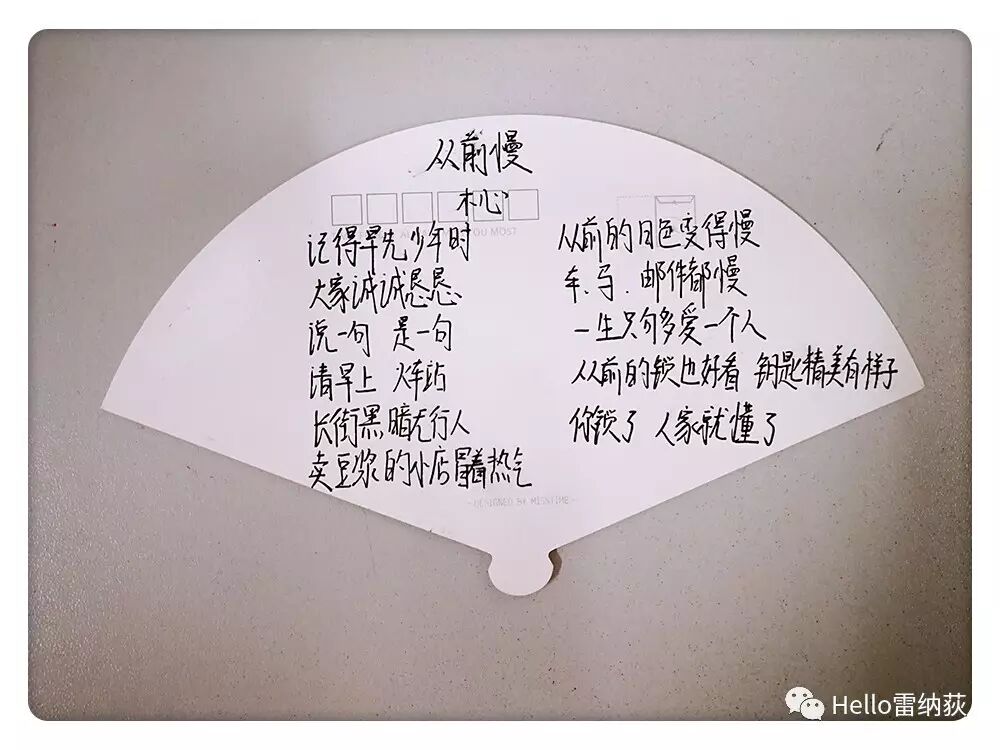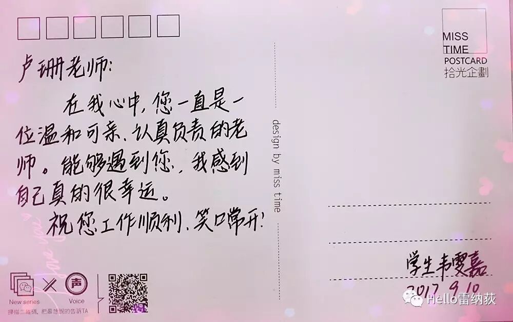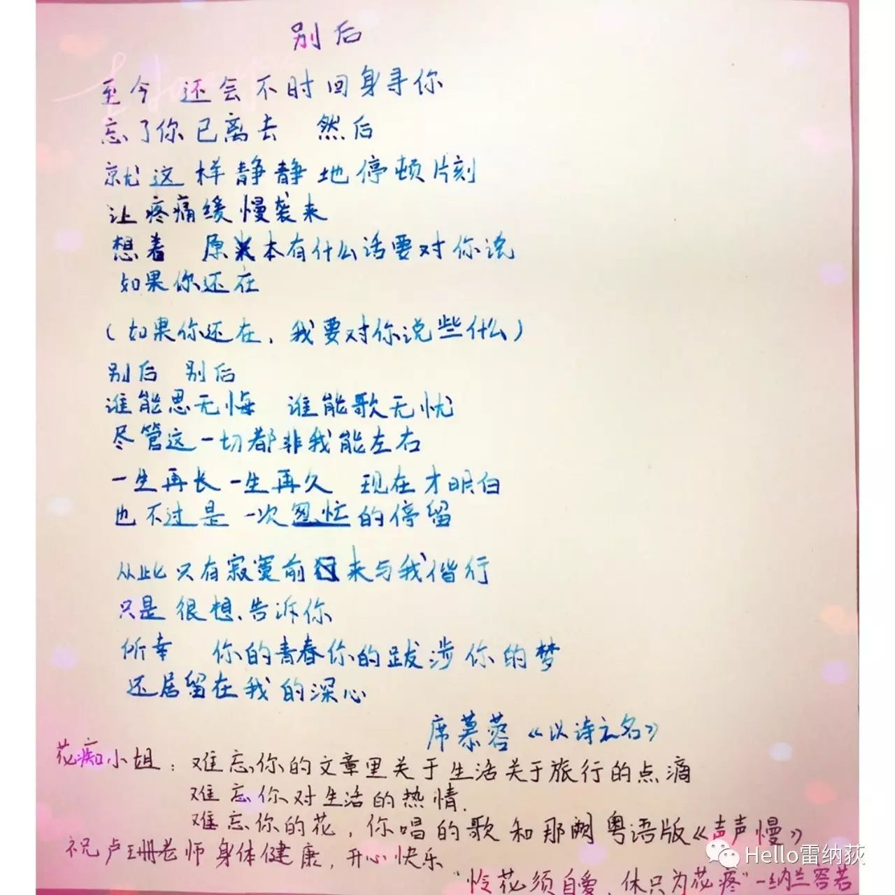 最后,祝珊珊老师工作顺利,身体健康,永远年轻漂亮,你永远是我心中最最最可爱、喜爱的老师。《从前慢》这首诗送给你,是希望时间慢一点,像从前一样。爱您。