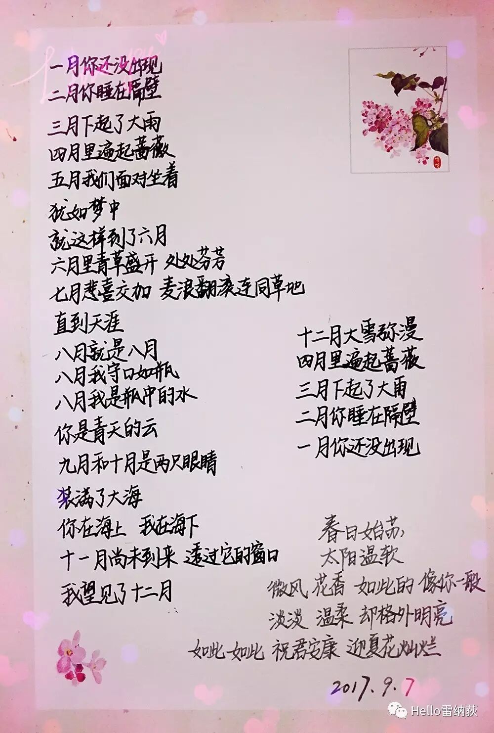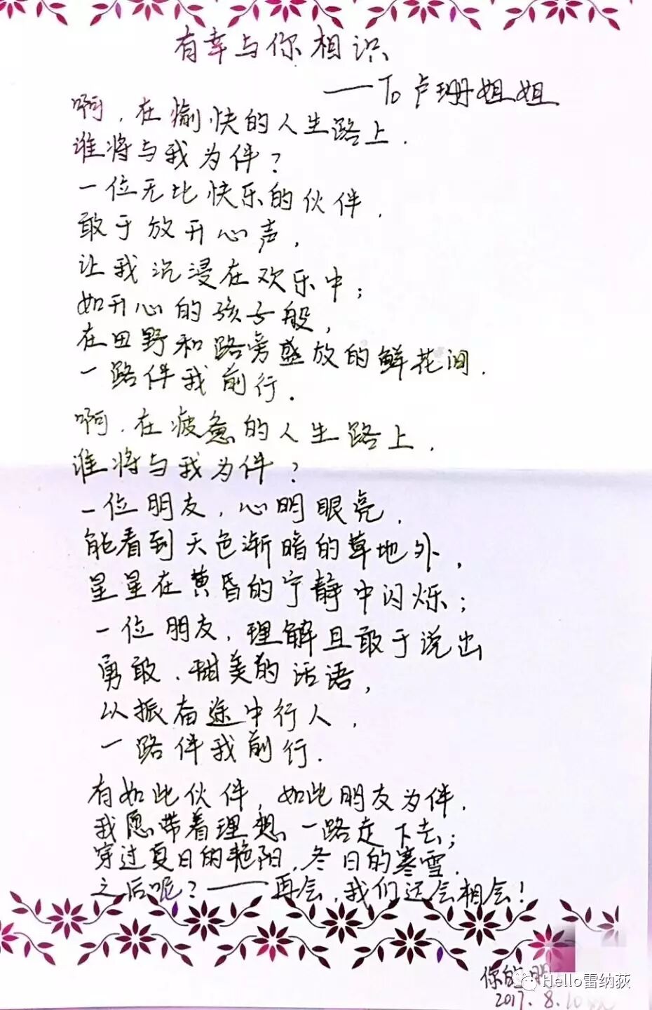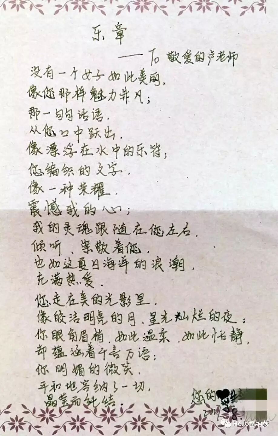 最后,祝珊珊老师工作顺利,身体健康,永远年轻漂亮,你永远是我心中最最最可爱、喜爱的老师。《从前慢》这首诗送给你,是希望时间慢一点,像从前一样。爱您。
